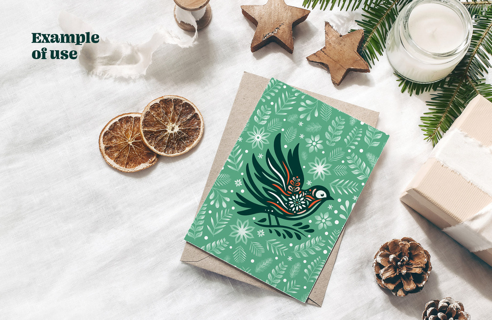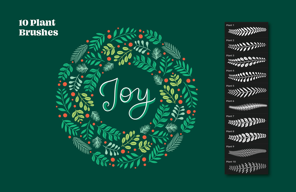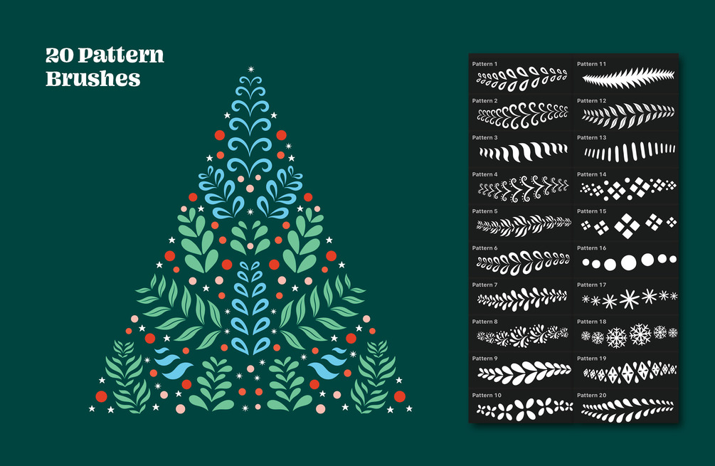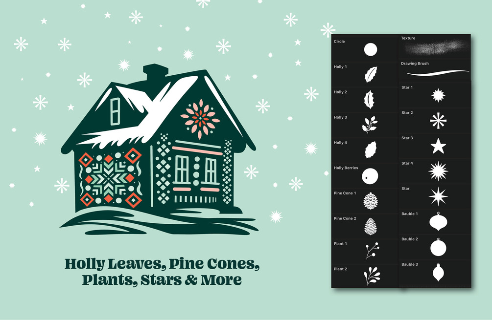10 plant brushes - 19 folk art christmas illustrations - 20 pattern brushes - 38 christmas decor stamps - 5 holly stamps - 2 pine cones - 2 plant stamps - texture brush - drawing brush - 5 star brushes - 3 baubles